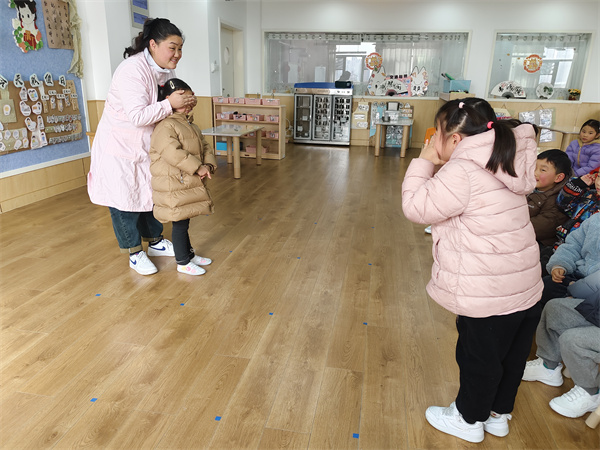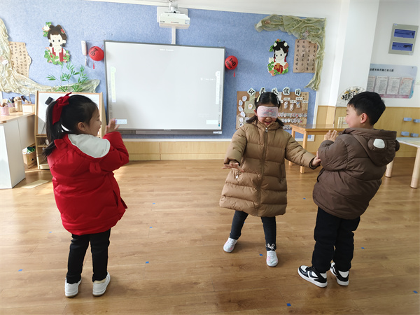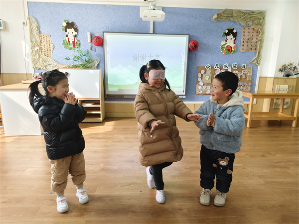 小耳朵很重要,让我们一起来玩一玩“听声音辨方向”的游戏吧!两名小朋友站在任意方位并发出声音,一位小朋友用眼罩捂住眼睛,当听到小朋友发出的声音后就去寻找他们在哪里。通过这个游戏,小朋友可以更好的了解到耳朵的灵敏性。