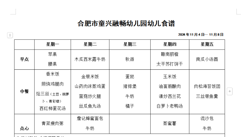 庐阳教育发展集团2024年11月4日-11月8日幼儿食谱