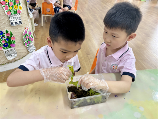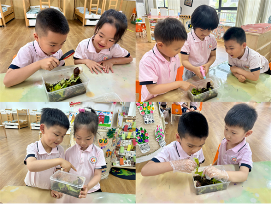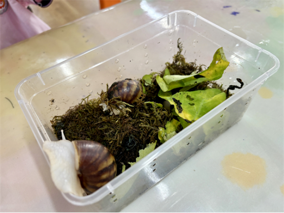 幼儿在初步了解了蜗牛的生活习性和喜欢吃的食物之后,对饲养白玉蜗牛有了很大的信心,班级里也开展了小小饲养员活动,幼儿会耐心地照顾白玉蜗牛,给蜗牛投喂食物、更换土壤等等。