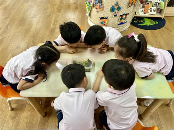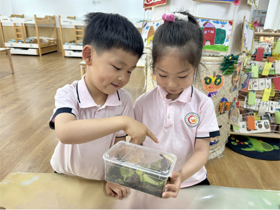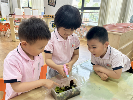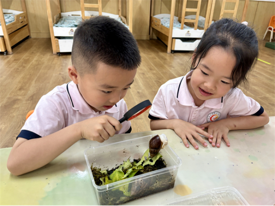 大自然充满了惊喜和挑战,一个小小的蜗牛就激发了幼儿巨大的探究热情。相比于仰望高处的自然物,幼儿更喜欢“蹲下来”观察地面上的自然物,就如与蜗牛的邂逅,在一次次的观察、一次次与蜗牛的互动中,幼儿见证了蜗牛的成长过程,也让我们看到幼儿对大自然本能的亲近和喜爱。在幼儿的探究里,每天都有新的发现。幼儿在玩中学、学中玩,收获着简单纯粹的快乐!