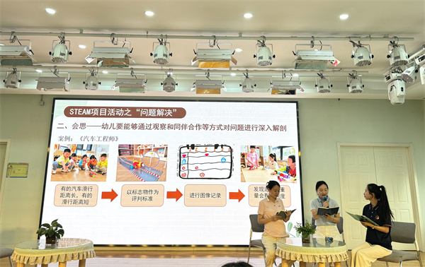 合肥市童兴融畅幼儿园教师何雨婷与合肥市长江路幼儿园杏林分园教师程丽、合肥市大西门幼儿园教师吴婷婷以自身案例为基础,谈一谈《STEAM教育项目活动之问题解决》。教师何雨婷围绕“乐问、会思、巧创、善言”四个方面,结合STEAM案例——《汽车工程师》,呈现了STEAM教育理念在问题解决中的应用与方法。