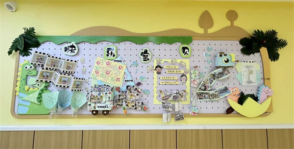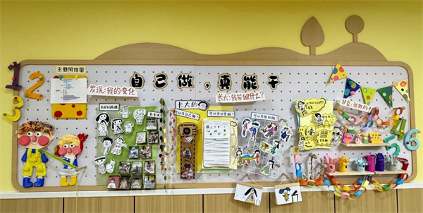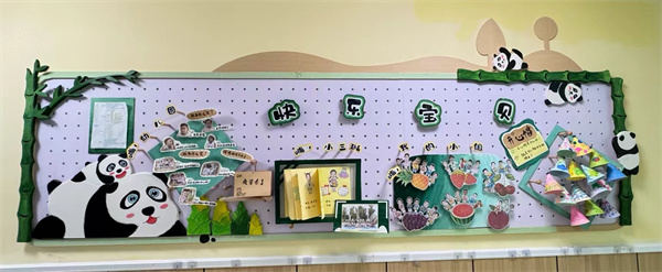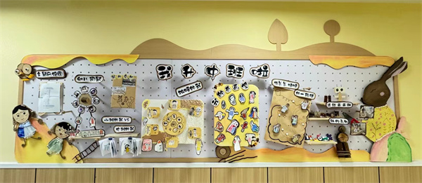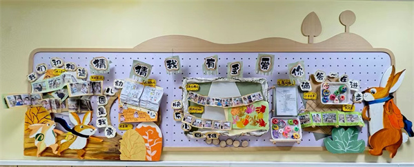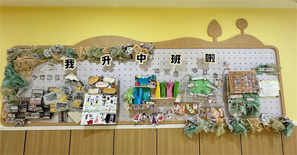 中班幼儿好奇好问,喜欢思考探究、动手操作。中班组教师提供多元的游戏材料支持幼儿探索世界,在与环境的互动之中获得成长。每一处装饰都是孩子喜欢的物品,每一件作品都是孩子的大作,用孩子的话、孩子的作品装扮出了会说话的墙面。
