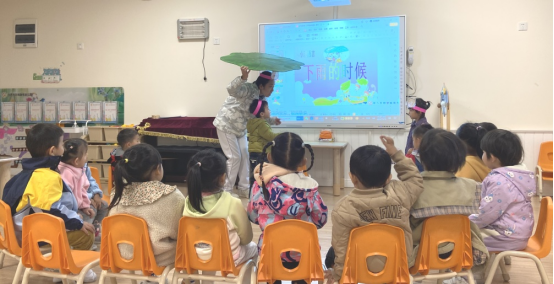 故事《下雨的时候》让孩子们懂得了遇到困难要动脑筋,想办法解决,体验帮助别人和被别人帮助的快乐。