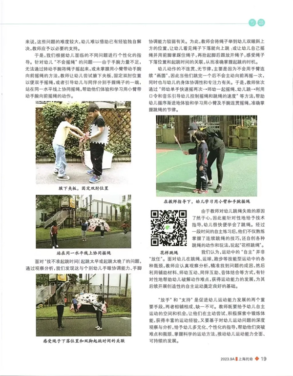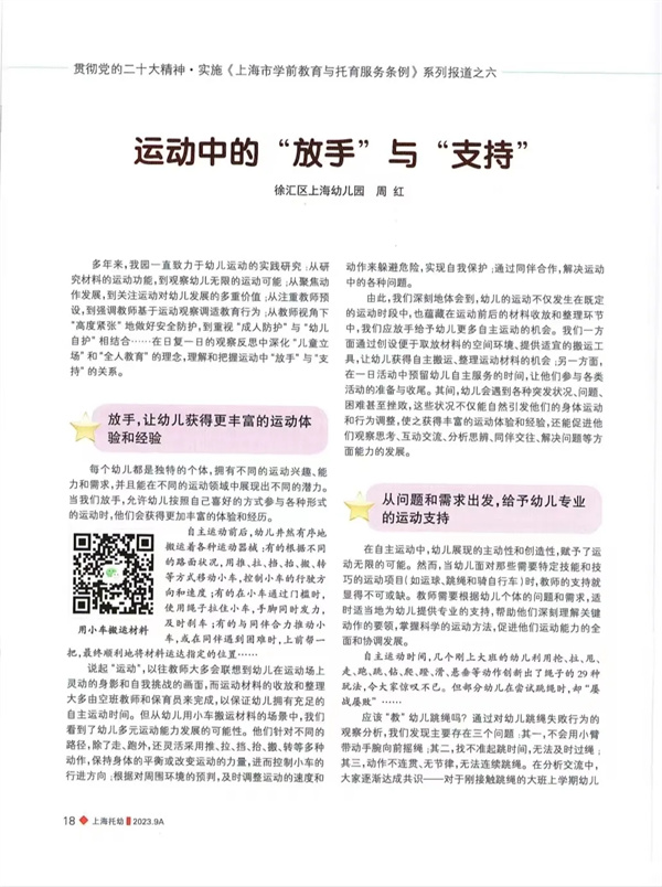 放手,让幼儿获得更丰富的运动体验和经验。“放手”并不表示教师“只要放手,只要旁观,无须指导”。真正的“放手”是一种智慧的退出,是教师“胸有成竹”的观察,是专业底气中的看似“无为”、实质“有为”。教师的放手是有准备的放手,教师为幼儿创造了一个有准备,有序的环境。让幼儿通过在运动前后的材料的收放和整理环节中让幼儿自主运动去尝试和探索,使之获得丰富的运动体验与经验。支持,是当幼儿在运动中遇到需要掌握某种技能时,则需要教师适时的支持与指导,从而促进幼儿的身体协调性的发展。
