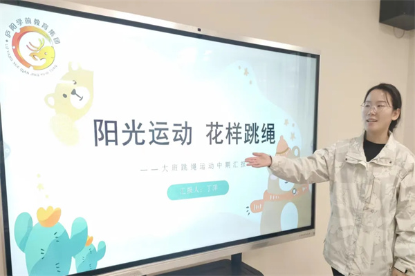 大班丁萍老师,通过跳绳案例的分享讲述了教师不仅要学会放手更要学会为幼儿提供支持和引导,教师的适宜支持和引导是儿童游戏和发展的重要保障,在幼儿游戏中,我们不难发现当幼儿游戏出现困难的时候,幼儿选择放弃的时候居多。当幼儿放弃自己选择的游戏时可能是因为幼儿的现有游戏水平不足以支持他的游戏状态或者是高于他的游戏水平。所以作为一名幼儿教师,要观察幼儿的游戏状态,观察幼儿的注意与兴趣,观察幼儿的活动主题是什么以及他已有的游戏经验,从幼儿与游戏材料的互动中反思自己投放的游戏材料、创设的游戏情景是否适宜幼儿的现有发展水平,在幼儿运动中遇到困难,及时介入给予支持。