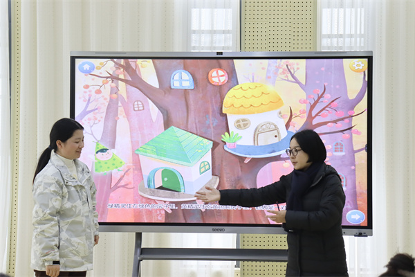 观摩园内教师集体活动后,进行了理论培训,庐阳学前教育集团业务主管胡宝云也参加了此次培训活动。许老师对音乐、美术、阅读、数学、科学这五个领域的课程进行了理论结合实际的方式进行了详尽的培训,让教师们对豚宝宝的教学软件有了更深的了解。