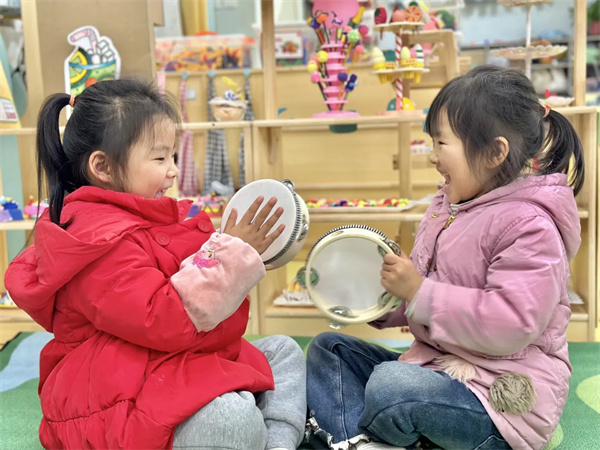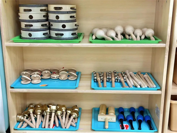 2. 尊重幼儿的兴趣爱好,准备一些合适的音乐玩具和装扮道具,创设家庭音乐角,让幼儿在活动区中自由、开心地敲打、探索。