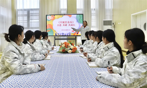 为使打击乐活动更好的渗透到幼儿一周课程中,合肥市蓝光融熠幼儿园全体教师在业务主任刘伟的带领下研讨学习《学前儿童艺术学习与发展核心经验》,了解到不同年龄阶段打击乐教学是音乐思维的启动,不只是拿着乐器演奏这一环节。而是幼儿感受音乐作品时在记忆中留下的有关音乐作品的表现特征。开展集体打击乐器演奏活动,也可以发展幼儿听辨节奏和音色的能力、良好的合作意识和熟练的动作协调技能。在乐器演奏活动中,幼儿还可以发展探索精神和创造能力。