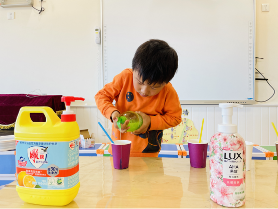 幼儿还选择了其他物品制作泡泡液,肥皂、洗手液,并用记录了下来。