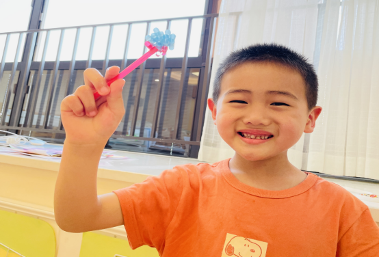 程程:“把聪明棒拼一拼就可以吹出泡泡。”