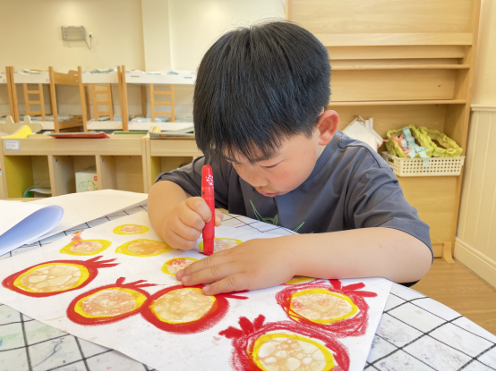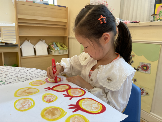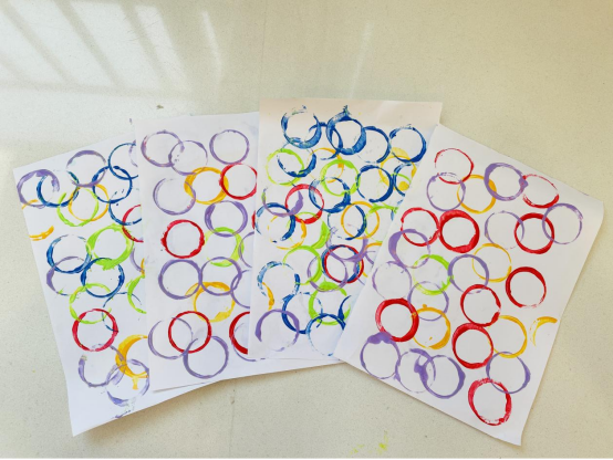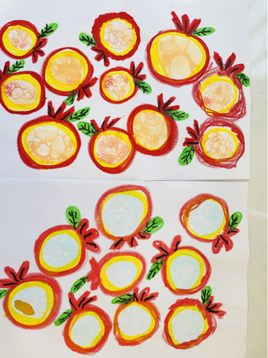 泡沫易碎,转瞬即逝。每个泡泡像是七彩的梦,幼儿想把这美丽的泡泡留住。幼儿利用瓶盖和拓印工具,在纸上拓印出了一个个五颜六色的泡泡。