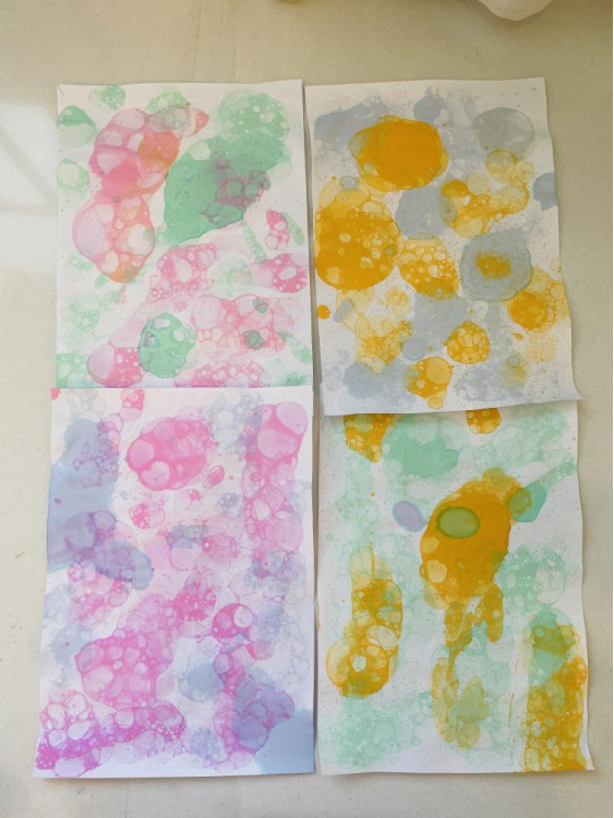 吹呀、吹呀、吹泡泡,泡泡好玩还能变出一幅幅美丽的图画。用吹泡泡的形式来画画,幼儿第一次接触,非常感兴趣。看似简单的吹泡泡,在实际操作过程中却碰到种种挫折,但幼儿不气馁 ,终于吹出了一个个漂亮的泡泡。