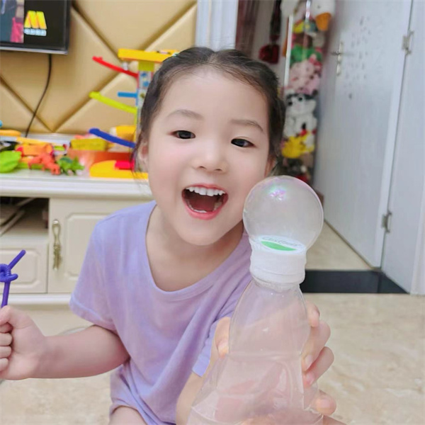 通过实际操作,孩子们知道了原来带有封闭小孔的材料才能吹出泡泡。他们拿着属于自己的专属工具吹泡泡