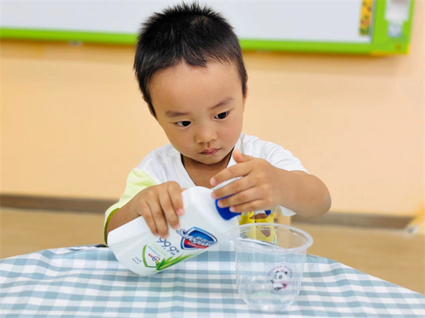 孩子们通过动手操作实验发现,在适量清水中加入我们生活中常见的洗手液、洗洁精、洗衣粉等都可以做出泡泡水,但是比例要合理,并且为了吹出的泡泡更加坚韧不易破,我们还可以加入了白糖。