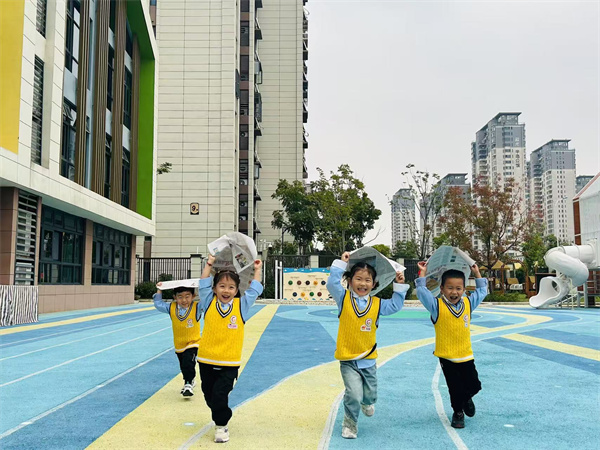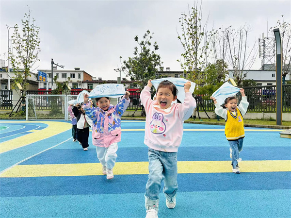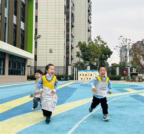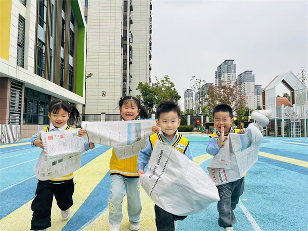 小朋友手拿着报纸,1.2.3准备——跑!孩子们尽情享受风带来的乐趣。