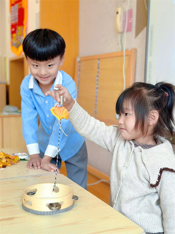 那么,怎么将树叶悬浮在空中呢?有幼儿提出可以用磁铁将树叶吸起来,于是我们开展了科学实验《悬浮的树叶》。