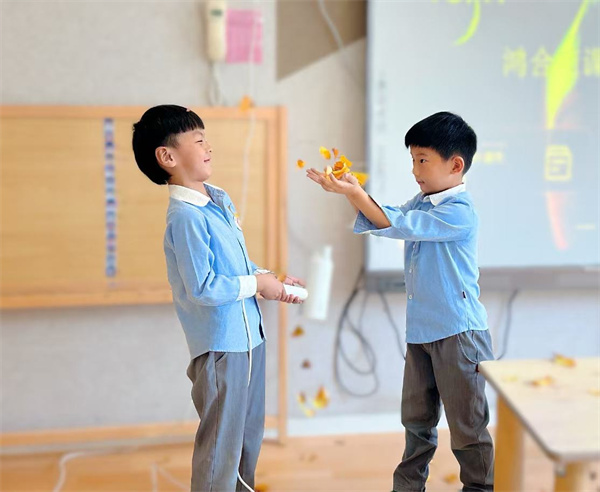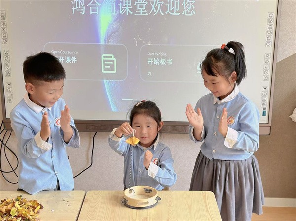 教学活动中,幼儿通过观看生动有趣的视频,了解树叶在季节变化中的自然现象,树叶在秋风的吹拂下纷纷扬扬地落下,可能会被风吹到小溪里,成为小鱼的庇护所,也可能会落在草地上,成为蚂蚁的游乐场,甚至有些树叶会被风吹到屋顶上,成为小鸟筑巢的材料。