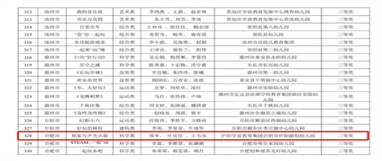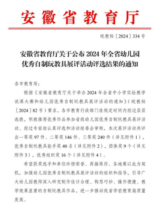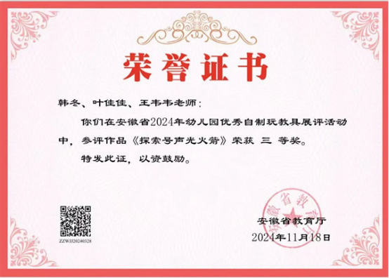 根据《安徽省教育厅关于举办2024年全省中小学实验教学说课大赛和幼儿园优秀自制玩教具展评活动的通知》(皖教秘〔2024〕82号)工作安排,2024年幼儿园优秀自制玩教具展评活动已经结束,经区市推荐,合肥市庐阳融创幼儿园韩冬老师、叶佳佳老师和王韦韦园长的自制玩教具作品《探索号声光火箭》荣获省级三等奖。