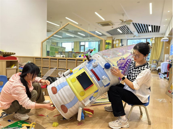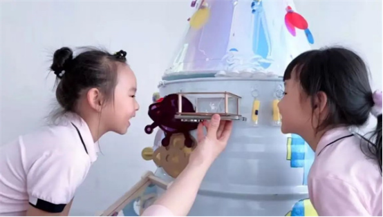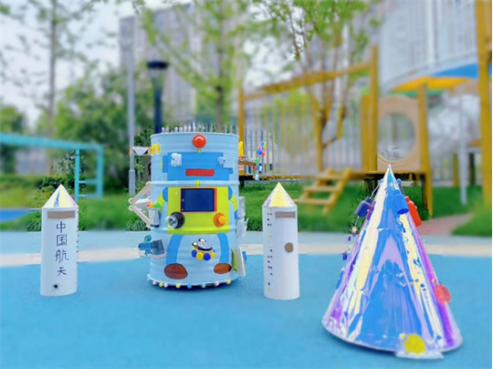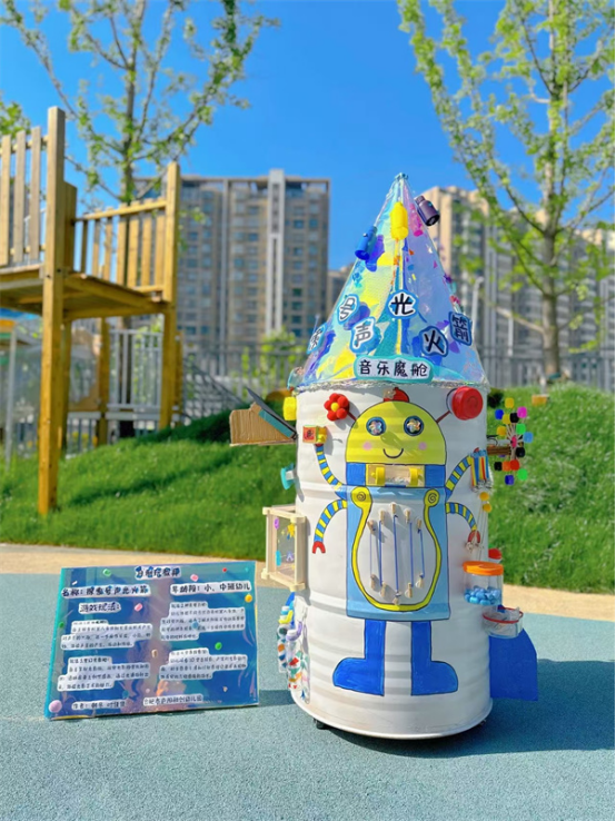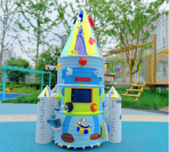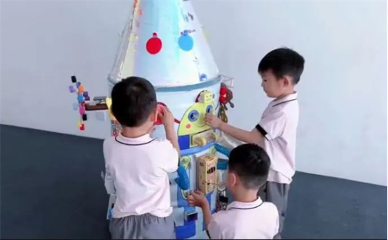 从灵感乍现到精心设计,从材料挑选到细致制作,每一个环节都倾注了三位老师对玩教具制作的用心。老师们设计的不仅仅是一件教具,更是幼儿对打开科学探索的神奇钥匙。火箭对于幼儿来说,是一种极具吸引力和教育意义的科学主题。它不仅能够激发幼儿对宇宙探索的兴趣,还能够帮助他们理解一些基本的科学原理。“探索号声光火箭”以其独特的外形和丰富的“内容”,生动诠释了“寓教于乐”的教育理念,在展现游戏活动的趣味性和学习性的同时,激发了幼儿对科学现象的好奇心和探索欲望,真正实现了“做中学”。