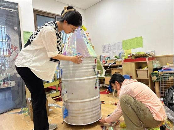 三位老师制作前期根据幼儿兴趣及年龄特点,结合园内特色、精心选材、巧妙构思,选择能操作、多变化、多功能的废旧材料,创设了自制玩教具《探索号声光火箭》,整体设计思路秉持着可持续发展和环保的科学理念,遵循“做中学”“做中教”的教育思想,教师将教学目标嵌入到游戏活动中,使幼儿能够在轻松愉悦的氛围中自主探索,培养他们探索观察能力、动手操作能力和科学探究精神。