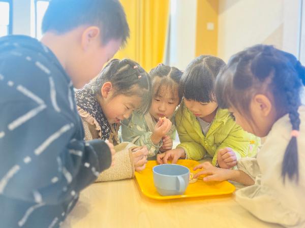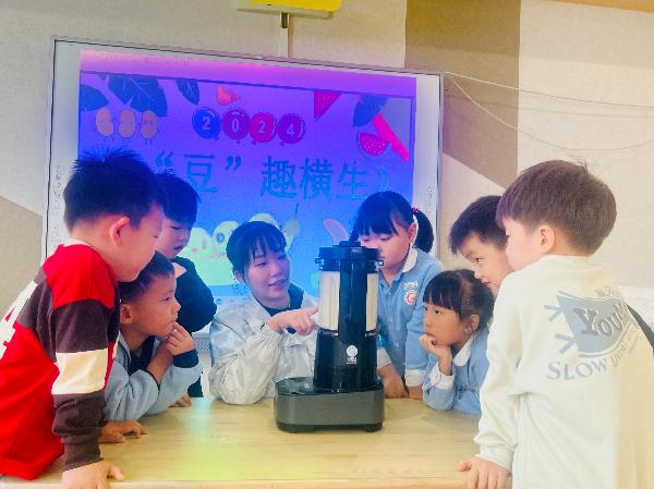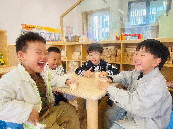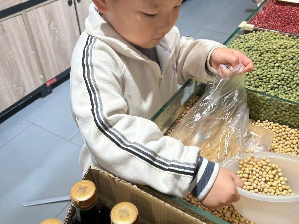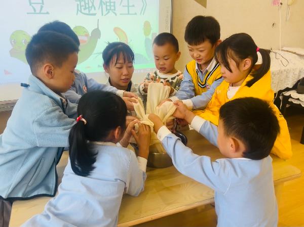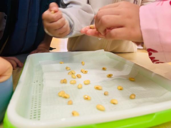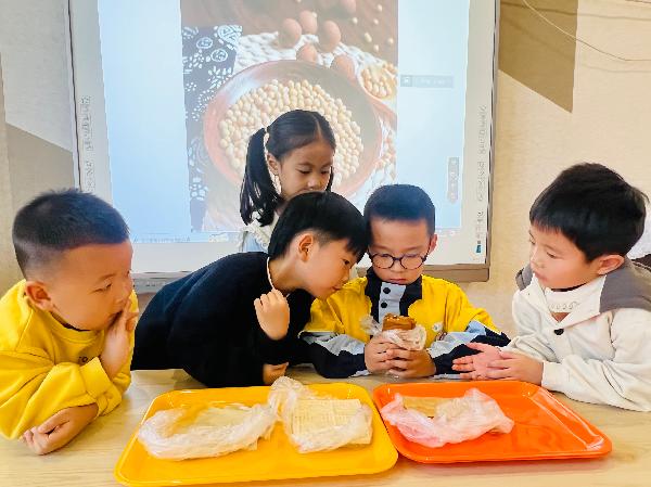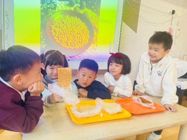 班级里开展了一系列以黄豆为原料的美食制作活动,包括制作醇厚的豆浆和嫩滑的豆腐等。在亲自动手制作的过程中,幼儿不仅体验到了劳动的乐趣,还品尝到了自己辛勤劳动的成果,深刻感受到了食物的来之不易。