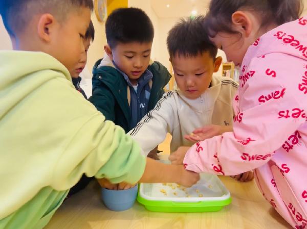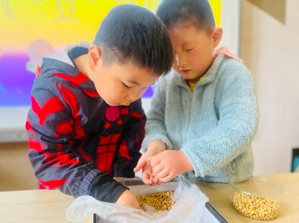 在《“豆”趣横生》的活动中,幼儿与黄豆经历了一场奇妙的邂逅。首先,他们通过观察黄豆的形态,细致地了解了黄豆的外观特征,这一环节极大地提升了他们的观察力。随后,在深入探索黄豆生长过程的学习中,幼儿的知识储备得到了进一步的丰富。