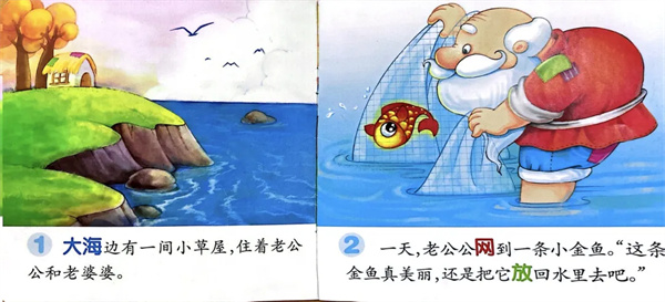 大海边有一间小草屋,住着老公公和老婆婆。一天,老公公网到一条小金鱼。“这条金鱼真美丽,还是把它放回水里去吧。”
