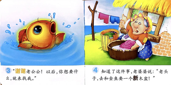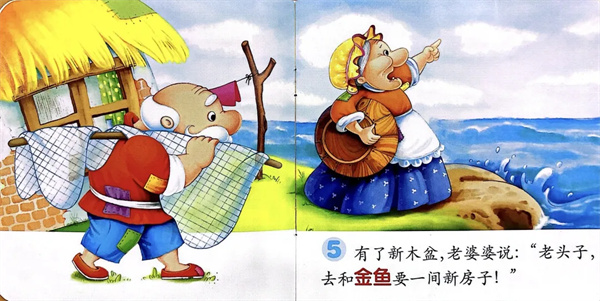 有了新木盆,老婆婆说:“老头子,去和金鱼要一间新房子!”