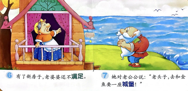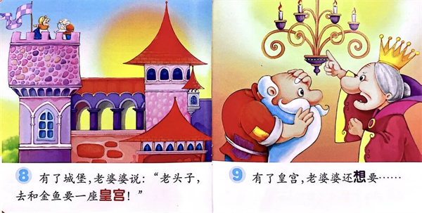 有了城堡,老婆婆说:“老头子,去和金鱼要一座皇宫!”有了皇宫,老婆婆还想要……