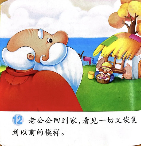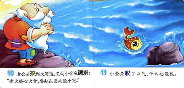 老公公来到大海边,又向小金鱼请求:“老太婆心太贪,要起东西来没个完。”小金鱼叹了口气,什么也没说。