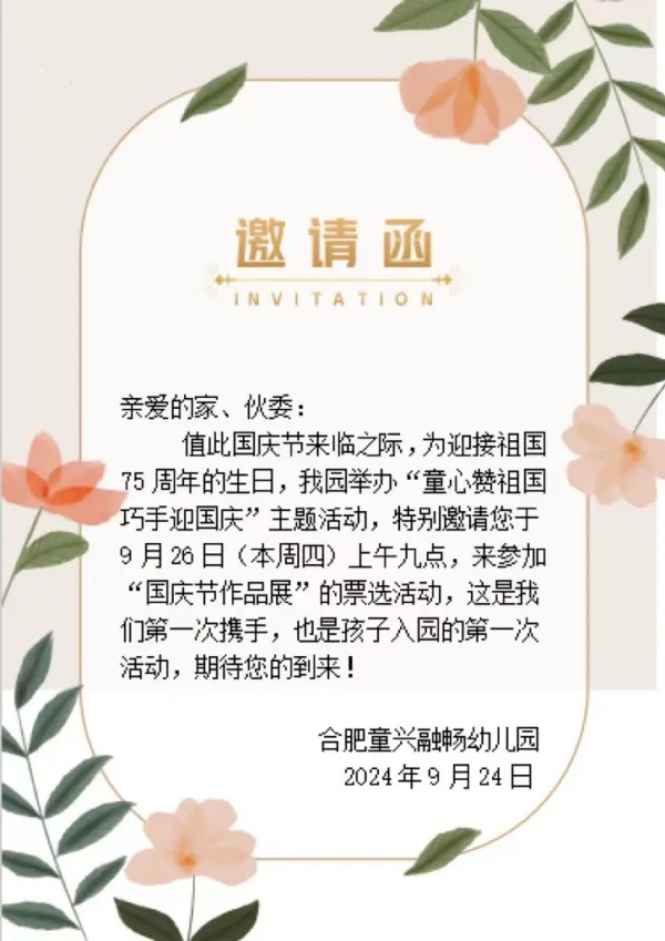 为进一步喜迎国庆75周年,激发幼儿的爱党爱国的情怀,培养幼儿爱祖国、爱家乡、爱人民的情感,激发创意思维,锻炼孩子们的动手能力,增进孩子和家长的亲子感情。2024年9月26日,合肥市童兴融畅幼儿园开展了“童心赞祖国 巧手迎国庆”亲子作品展示活动,为祖国妈妈献上了一份真诚的生日贺礼。