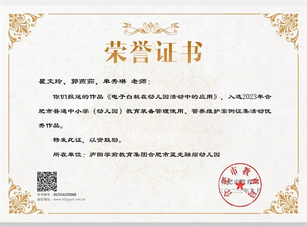 合肥市蓝光融熠幼儿园瞿文玲、郭燕茹、单秀琳《电子白板在幼儿园活动中的应用》作品入选合肥市2023年中小学(幼儿园)教育装备管理使用、管养维护案例展示活动。