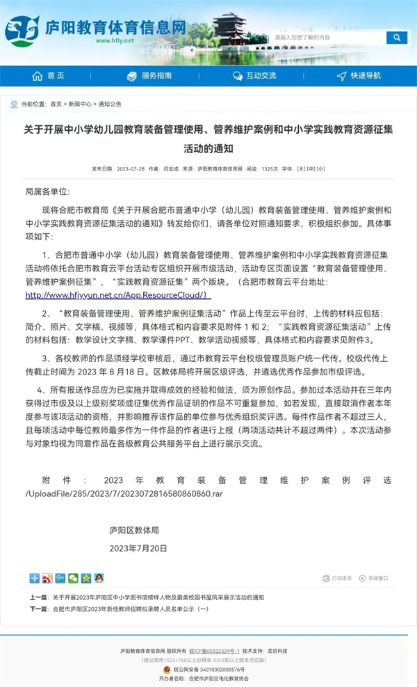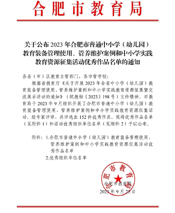 为更好地管理、维护、使用教育装备,推广好的经验和做法,不断提高普通中小学(幼儿园)教育装备的管理应用水平,进一步完善中小学信息化设备运维保障机制,推进学校教育技术装备与教育教学深度融合。合肥市开展了普通中小学(幼儿园)教育装备管理使用、管养维护案例和中小学实践教育资源征集活动。