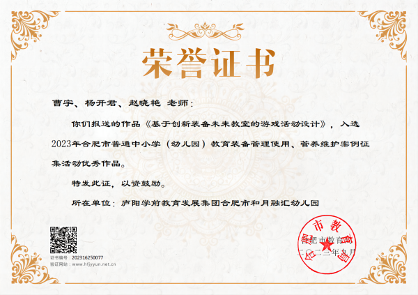 合肥市和月融汇幼儿园曹宇、杨开君、赵晓艳《基于创新装备朱来教空的游戏活动设计》作品入选合肥市2023年中小学(幼儿园)教育装备管理使用、管养维护案例展示活动。