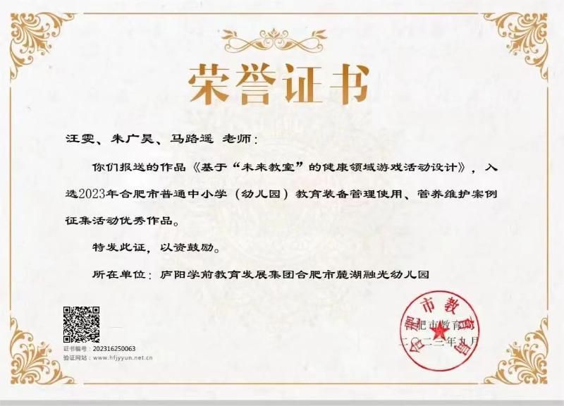 合肥市麓湖融光幼儿园汪雯、朱广昊《基于创新装备朱来教空的游戏活动设计》作品入选合肥市2023年中小学(幼儿园)教育装备管理使用、管养维护案例展示活动。