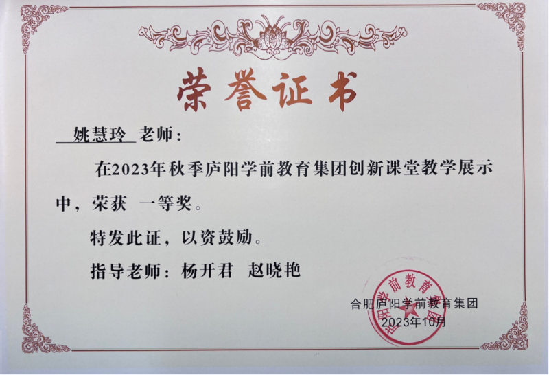 庐阳学前教育集团和月融汇园:姚慧玲老师创新课堂教学展示中荣获一等奖