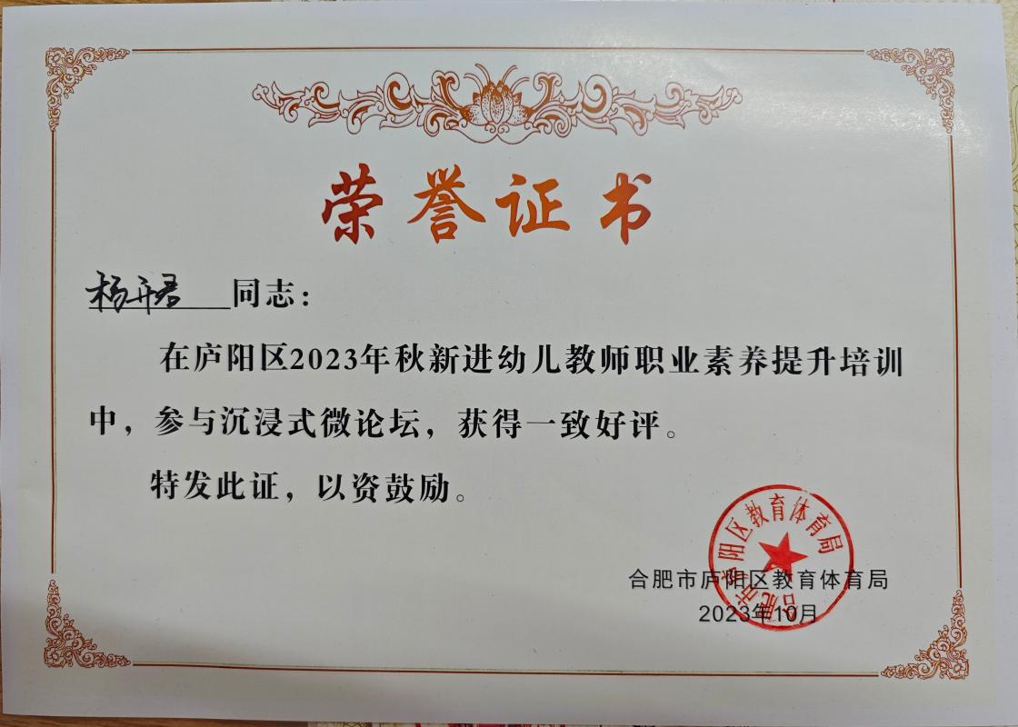 庐阳学前教育集团和月融汇园:执行园长杨开君庐阳区2023秋进幼儿教师职业素养提升获得一致好评