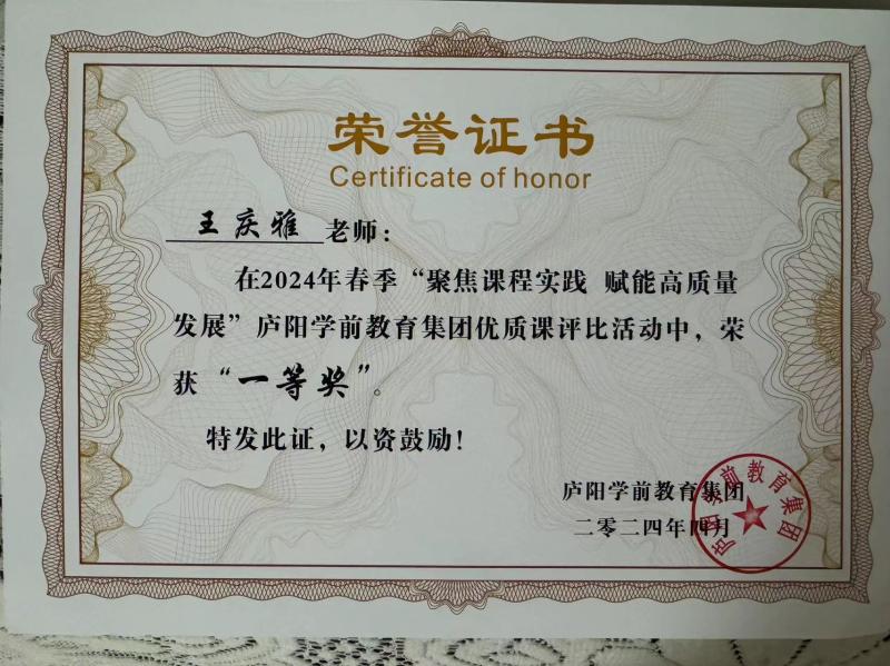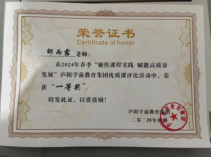 庐阳学前教育集团麓湖融光园:邵雨露、王庆雅老师在2024年春季“聚焦课程实践 赋能高质量发展”庐阳学前教育集团优质课评比活动中分别荣获一等奖、一等奖