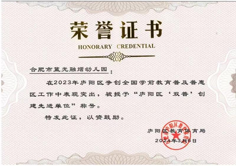 庐阳学前教育集团蓝光融熠园:荣获“庐阳区双普,创建先进单位”称号。
