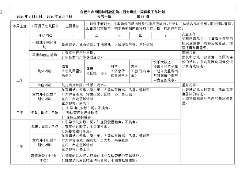 庐阳学前教育集团和月融汇园:大班第十五周保教工作计划
