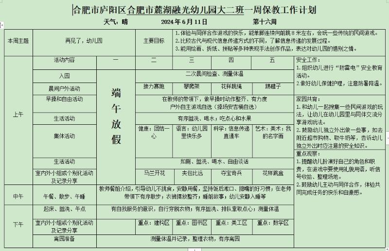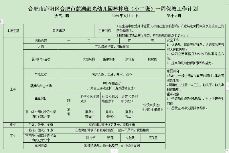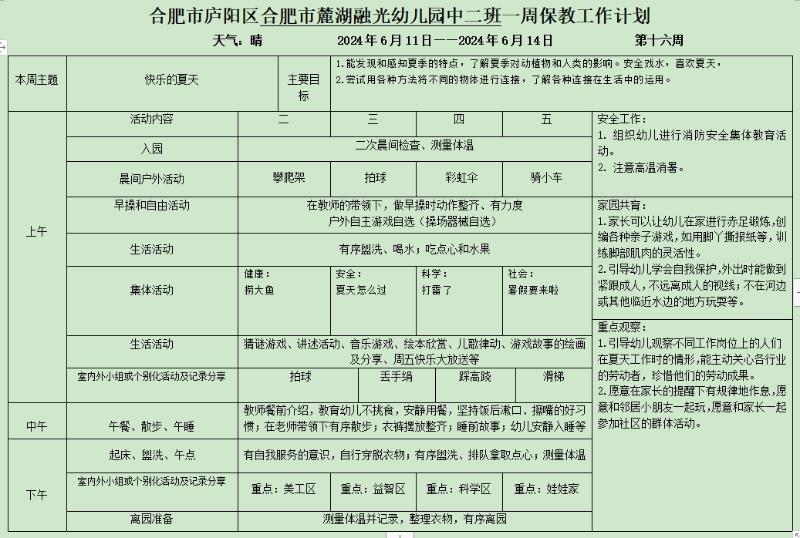 庐阳学前教育集团麓湖融光园:六月份第二周周计划
