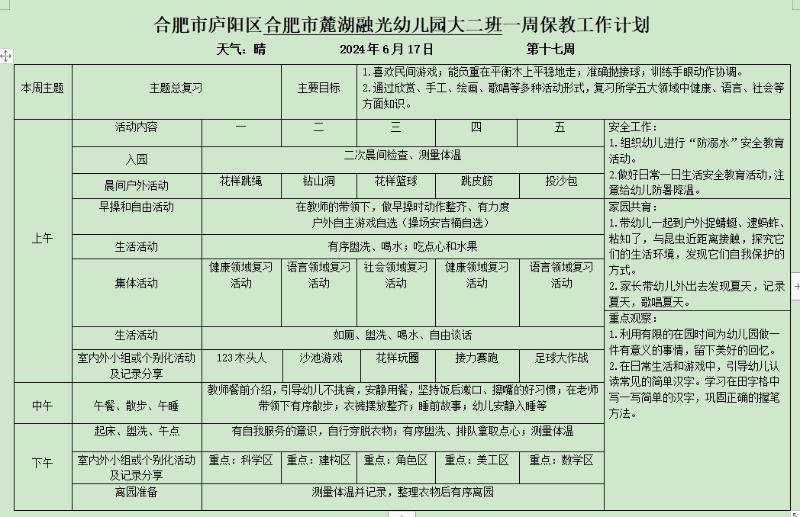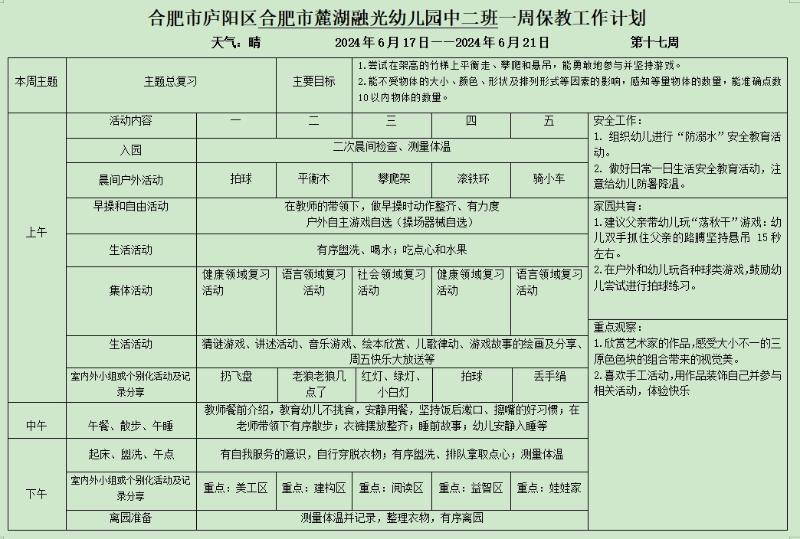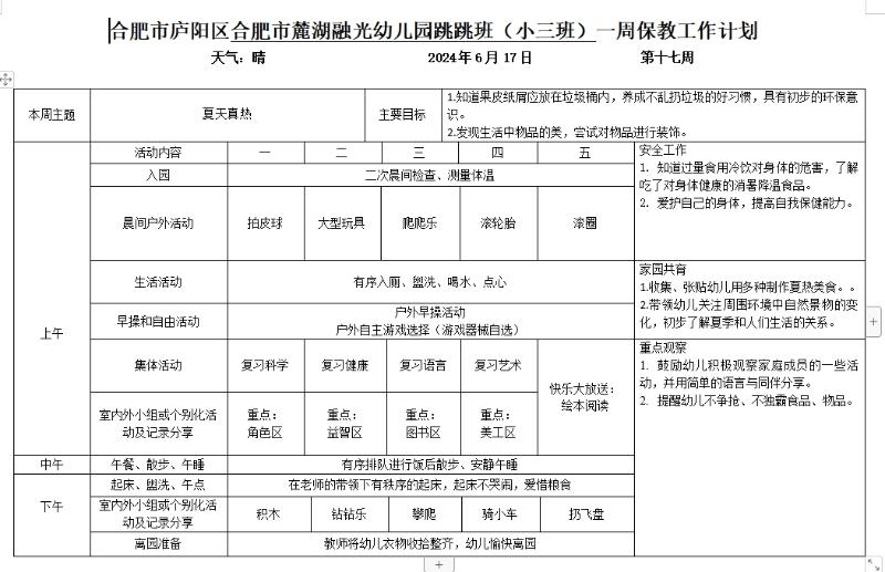 庐阳学前教育集团麓湖融光园:六月份第三周周计划