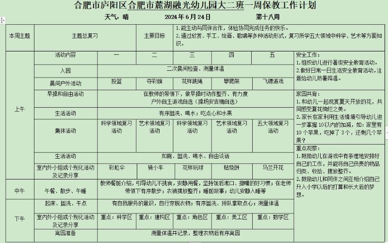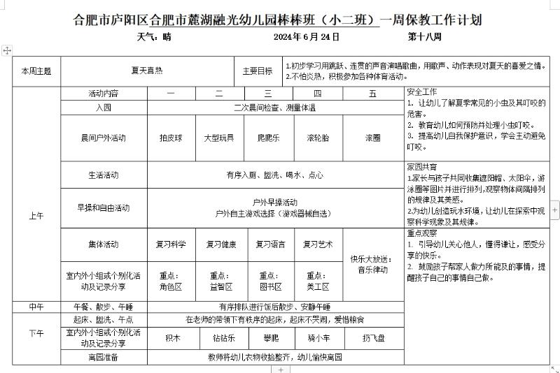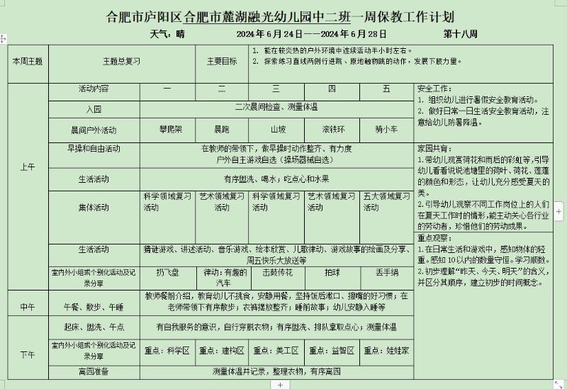 庐阳学前教育集团麓湖融光园:六月份第四周周计划
