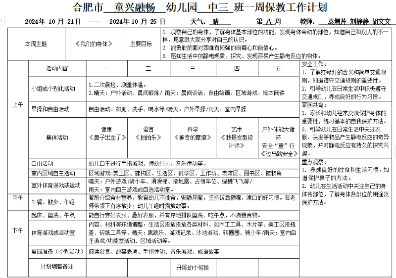 庐阳教育发展集团童兴融畅园:中班第八周保教工作计划