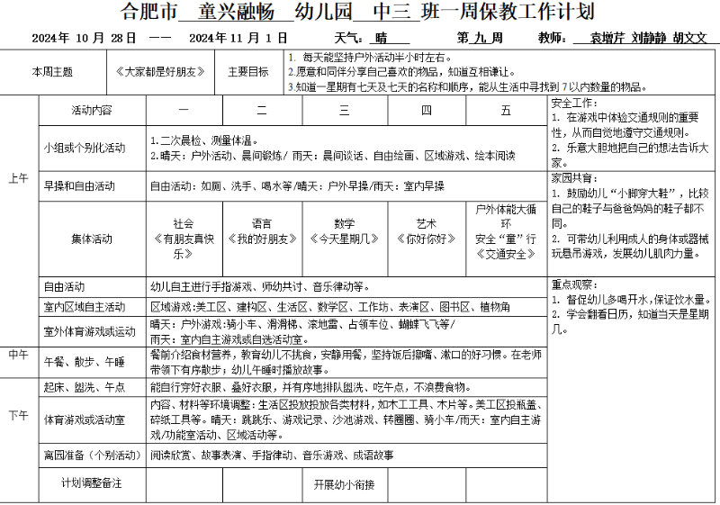庐阳教育发展集团童兴融畅园:中班第九周保教工作计划