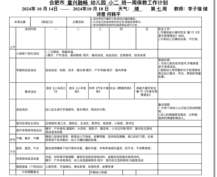 庐阳教育发展集团童兴融畅园:小班第七周保教工作计划