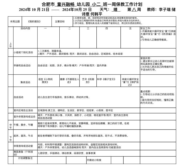 庐阳教育发展集团童兴融畅园:小班第八周保教工作计划