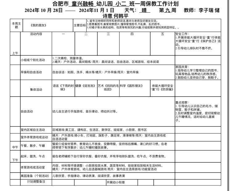庐阳教育发展集团童兴融畅园:小班第九周保教工作计划