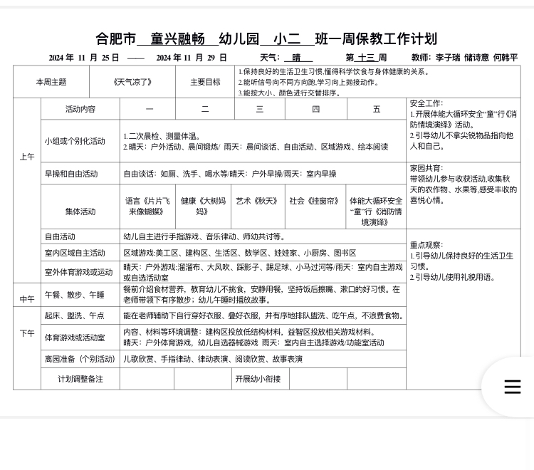 庐阳教育发展集团童兴融畅园:小班第十三周保教工作计划